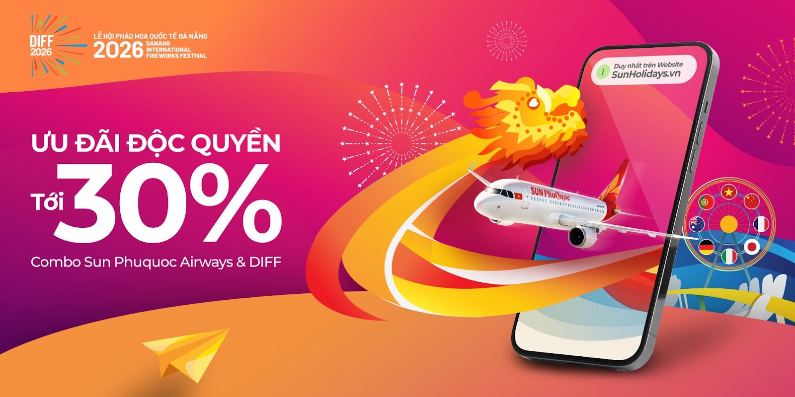 Đây là chính sách vé nổi bật nhất mùa DIFF 2026: combo vé máy bay Sun PhuQuoc Airways + vé xem Lễ hội pháo hoa quốc tế Đà Nẵng mang lại mức ưu đãi lên đến 30% so với đặt riêng lẻ.