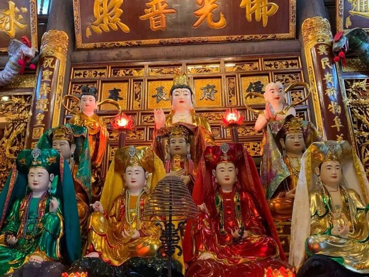 Trong chính điện, nơi trang trọng nhất được dành để thờ chư vị Thánh Mẫu. Trên hương án khắc ba dòng chữ mang ý nghĩa tâm linh sâu sắc: